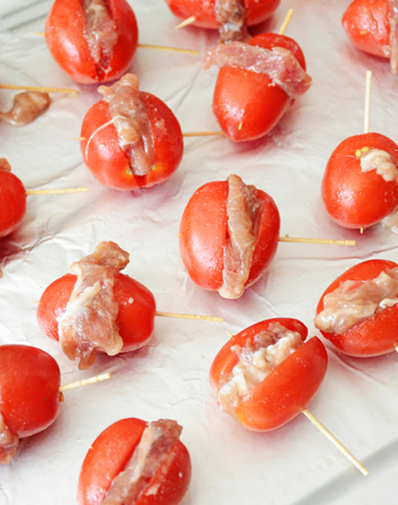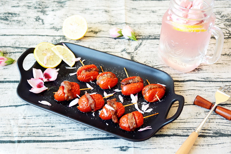 - 材料: 圣農(nóng)一整塊牛排1包 圣女果20個 黑胡椒粉少許 細(xì)鹽少許 橄欖油視情況而定 步驟: 圣女果洗凈,中間切口(不要切斷) 一整塊牛排完全解凍,平均切成20個牛肉丁 將牛肉丁塞入圣女果,用牙簽串好固定 油的錫紙烤盤上擺好,撒上黑胡椒 刷一層橄欖油 放入預(yù)熱好的烤箱190度中層上下火烤10分鐘
